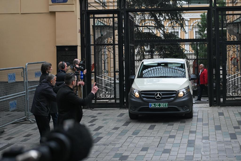 4月10日,在土耳其伊斯坦布爾,載有美國(guó)代表的車輛駛離俄羅斯駐伊斯坦布爾總領(lǐng)館。新華社記者劉磊攝