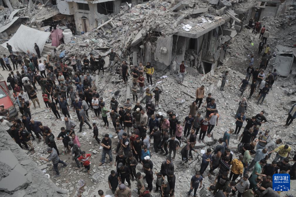 5月15日,在加沙地帶北部杰巴利耶難民營(yíng),巴勒斯坦人查看以軍轟炸后的建筑廢墟。新華社發(fā)(阿卜杜勒·拉赫曼·薩拉馬攝)