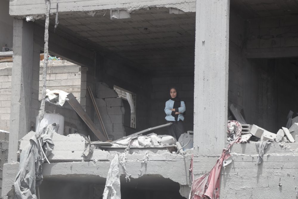 5月17日,在加沙地帶北部杰巴利耶難民營,一名女子站在破損的房屋中。新華社發(fā)(阿卜杜勒拉赫曼·薩拉馬 攝)