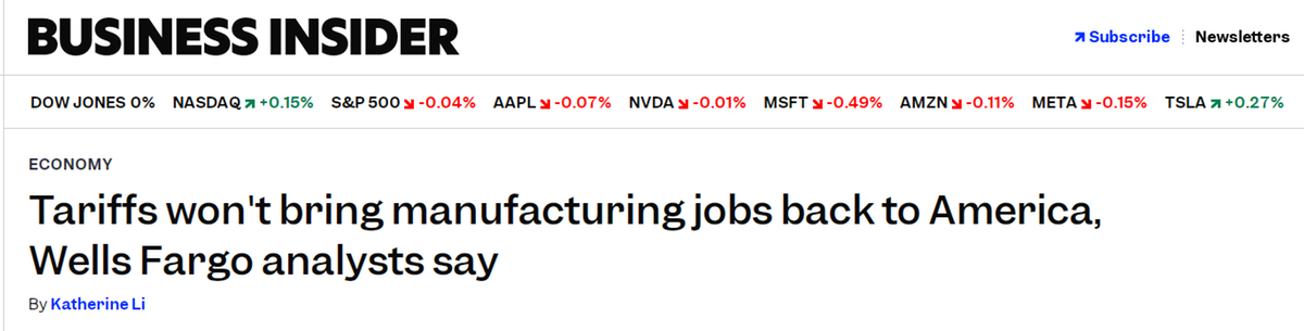富國銀行最新報告明確指出,美國的高額關(guān)稅政策難以實現(xiàn)制造業(yè)就業(yè)的持久反彈。