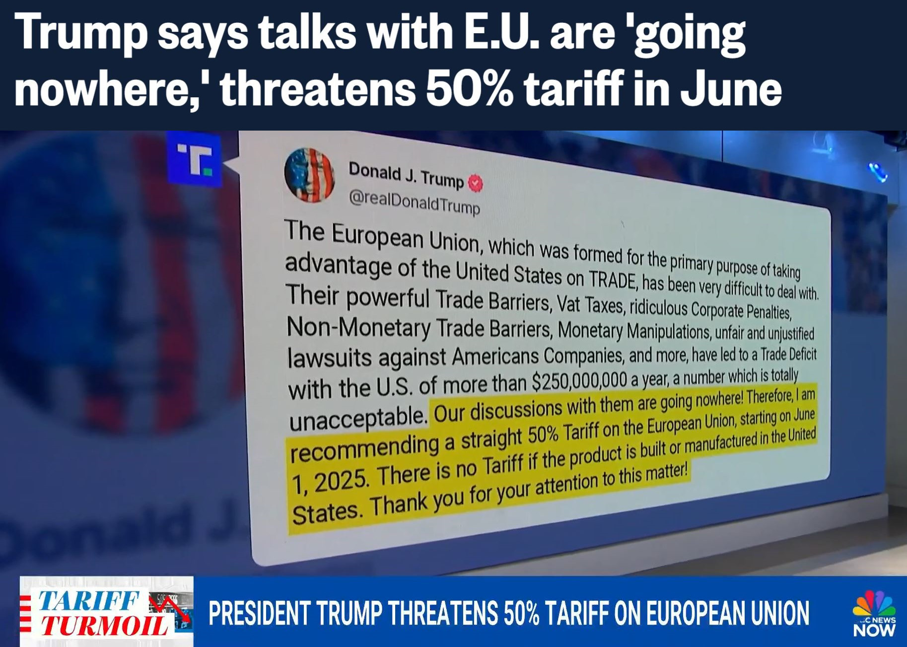 美國(guó)總統(tǒng)特朗普23日在社交媒體發(fā)文威脅稱,由于美國(guó)與歐盟的談判“毫無(wú)進(jìn)展”,他建議從6月1日起對(duì)來(lái)自歐盟的商品征收50%的關(guān)稅。