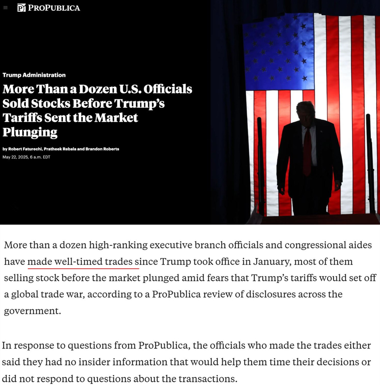 最近,美國(guó)“專業(yè)公眾”新聞?wù){(diào)查網(wǎng)站在查詢了數(shù)百份證券交易披露報(bào)告后發(fā)現(xiàn),自本屆美國(guó)政府1月上臺(tái)以來(lái),有十幾名美國(guó)政府高級(jí)官員、國(guó)會(huì)工作人員乃至國(guó)會(huì)議員進(jìn)行了時(shí)機(jī)“恰到好處”的交易,其中大部分人在美國(guó)關(guān)稅政策導(dǎo)致市場(chǎng)暴跌之前拋售了股票;還有人則在相關(guān)法案獲批前“及時(shí)”購(gòu)買了該法案所利好的行業(yè)公司股票。