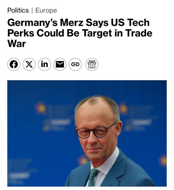 德國總理默茨:“目前,美國科技公司在歐盟受到‘大力保護’,包括在稅收方面,而這種情況可以改變。我并不想讓對抗升級,而是希望共同解決這個問題。在歐盟看來,貿(mào)易戰(zhàn)沒有贏家。(可是)在美國看來,關(guān)稅能夠單方面保護美國經(jīng)濟,也是一種‘零和游戲’,即當(dāng)歐盟經(jīng)濟變得更糟糕時對美國有利。”