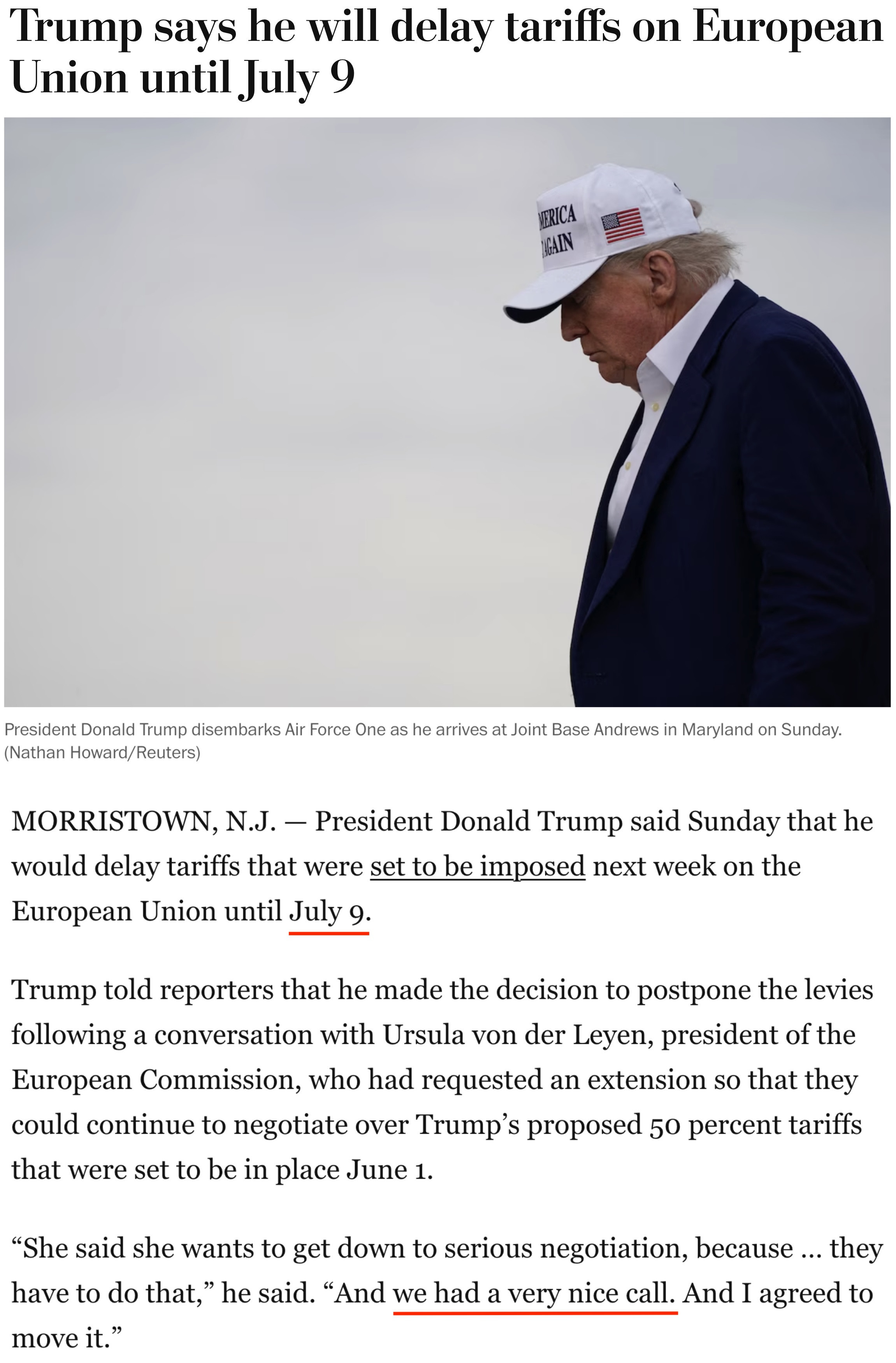 他25日告訴記者,自己當(dāng)天與歐盟委員會(huì)主席馮德萊恩“愉快”地通了電話,并應(yīng)對(duì)方要求,決定將原計(jì)劃從6月1日開(kāi)始對(duì)歐盟加征的50%的關(guān)稅推遲到7月9日,以便雙方有時(shí)間就此進(jìn)行談判。