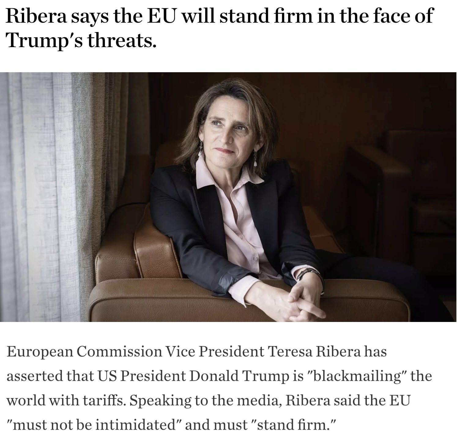 對(duì)此,歐盟委員會(huì)執(zhí)行副主席里貝拉表示,美方的這種勒索行為是不能容忍的。