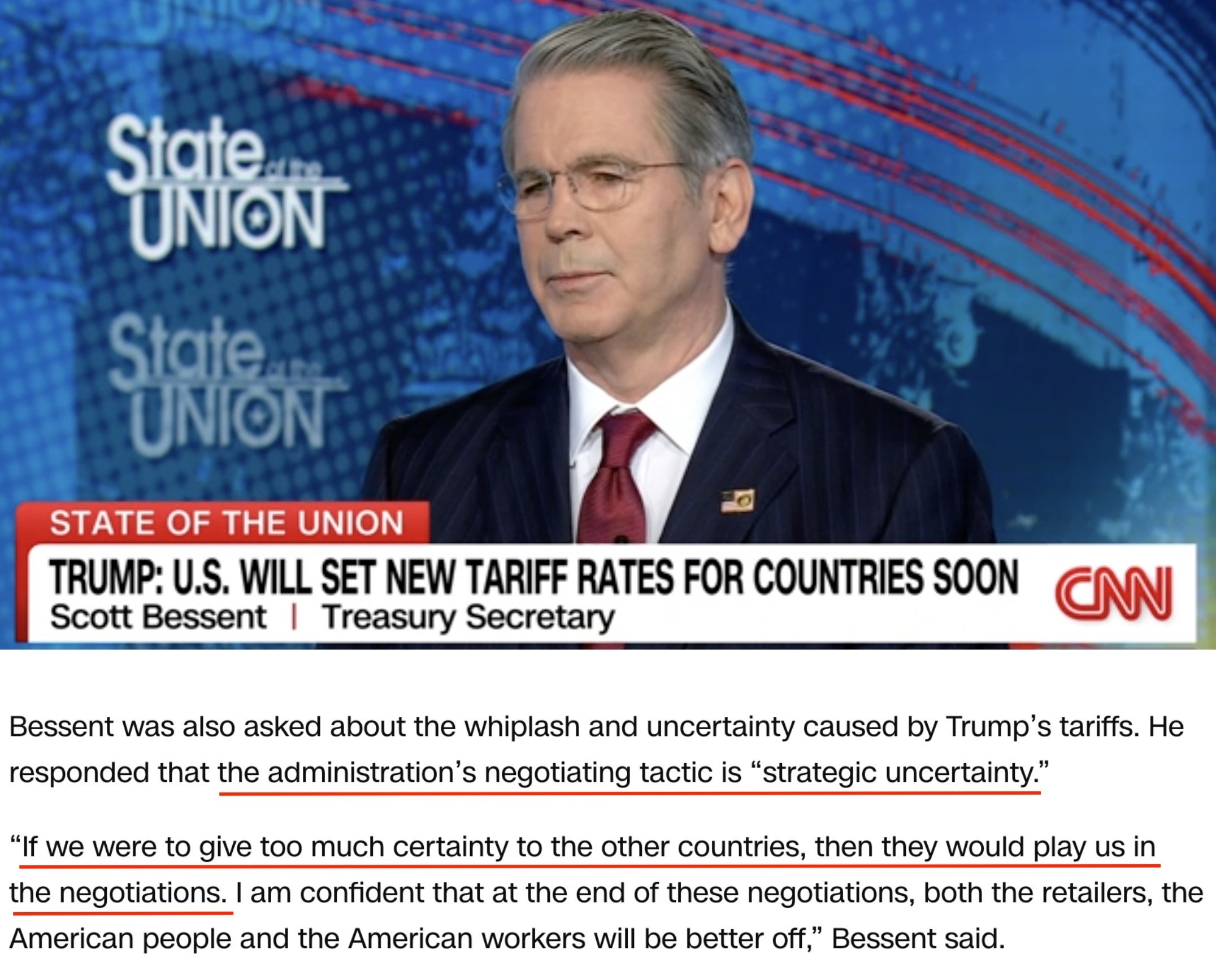 說(shuō)到美國(guó)關(guān)稅的不確定性,美國(guó)財(cái)長(zhǎng)貝森特近日接受采訪時(shí)曾有過(guò)一番“高論”。據(jù)他稱,在美國(guó)與貿(mào)易伙伴展開(kāi)關(guān)稅談判之際,美國(guó)政府表現(xiàn)出的“戰(zhàn)略不確定性”是一種談判策略,而非缺點(diǎn)。