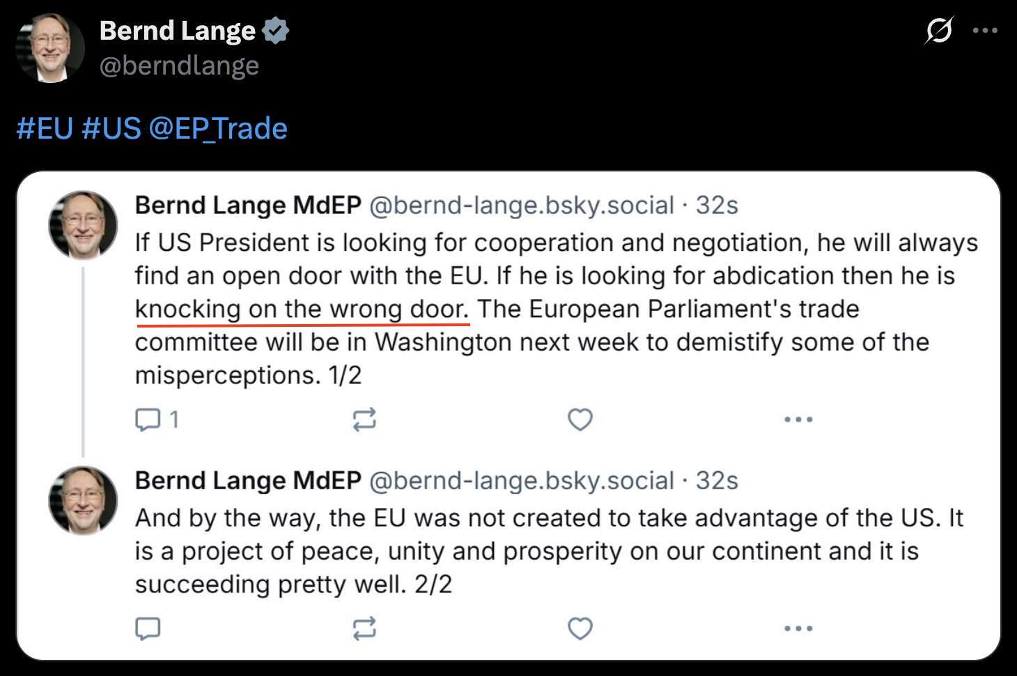 “如果美國(guó)尋求合作與談判,歐盟總是愿意敞開(kāi)大門;但如果只是想讓我們照單全收美方的要求,那它就是敲錯(cuò)了門?!?/p>