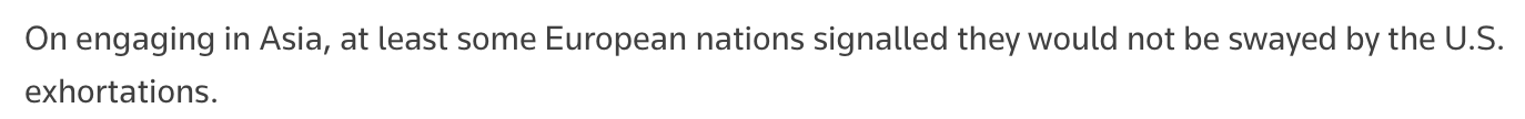 文章注意到歐盟外交與安全政策高級(jí)代表卡婭·卡拉斯的發(fā)言,稱她似乎將歐盟定位為亞洲富有成效的合作伙伴。她認(rèn)為,亞洲或許可以成為一種新選擇,以應(yīng)對(duì)美國(guó)如今的日益反復(fù)無常、奉行保護(hù)主義,以及不再重視基于規(guī)則的國(guó)際秩序。