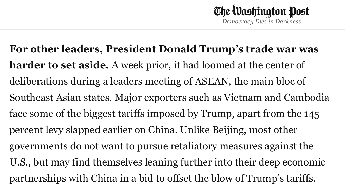 文章說,盡管大多數(shù)亞洲國(guó)家的政府沒有對(duì)美國(guó)采取反制措施,但它們都更傾向于進(jìn)一步鞏固與中國(guó)的深厚經(jīng)濟(jì)伙伴關(guān)系,以抵消美國(guó)關(guān)稅帶來的沖擊。
