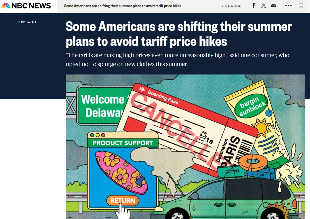 文章報(bào)道了畢馬威會(huì)計(jì)師事務(wù)所最近發(fā)布的一份消費(fèi)者調(diào)查。調(diào)查顯示,由于關(guān)稅,50%的美國消費(fèi)者正在削減購買量,49%的消費(fèi)者正在積極尋找優(yōu)惠和折扣。而當(dāng)被問及具體的夏季計(jì)劃時(shí),許多美國人表示他們雖然還會(huì)選擇旅行,但在其他方面已經(jīng)削減了個(gè)人支出。