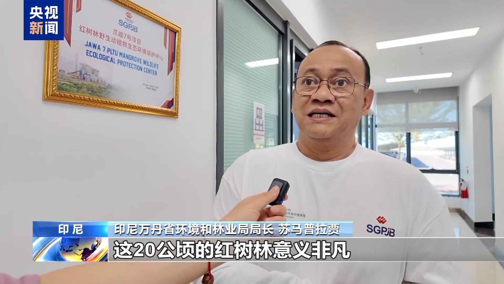 總臺記者 李琳:我現(xiàn)在所在的位置是印尼(單機(jī)容量)最大的火力發(fā)電廠。我現(xiàn)在所在的這個(gè)平臺有80米高。從我身后大家可以看到一大片紅樹林和電廠是和諧共生。那么在最開始,這片紅樹林只有5公頃的面積,而隨著企業(yè)不斷地種植,現(xiàn)在已經(jīng)達(dá)到了20公頃。