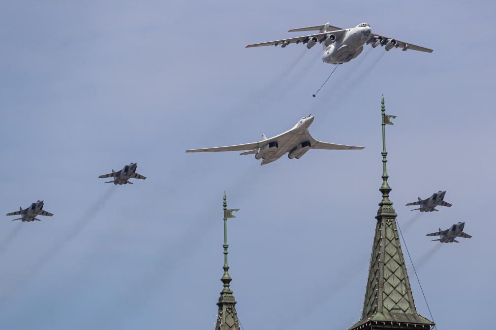 2022年5月7日,在俄羅斯首都莫斯科,米格-31戰(zhàn)機(jī)、圖-160戰(zhàn)略轟炸機(jī)、伊爾-78空中加油機(jī)(從后至前)編隊(duì)飛過紅場上空。新華社記者白雪騏攝