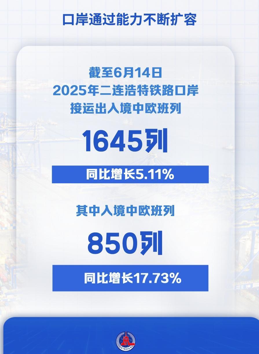 二連浩特口岸是中歐班列中通道進(jìn)出境的唯一鐵路口岸,截至6月14日,2025年二連浩特鐵路口岸接運(yùn)出入境中歐班列1645列,同比增長5.11%,其中入境中歐班列850列,同比增長17.73%。