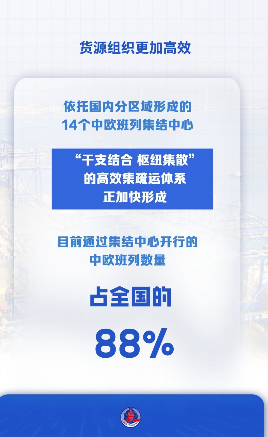 依托國內(nèi)分區(qū)域形成的14個(gè)中歐班列集結(jié)中心,“干支結(jié)合、樞紐集散”的高效集疏運(yùn)體系正加快形成,目前通過集結(jié)中心開行的中歐班列數(shù)量占全國的88%。