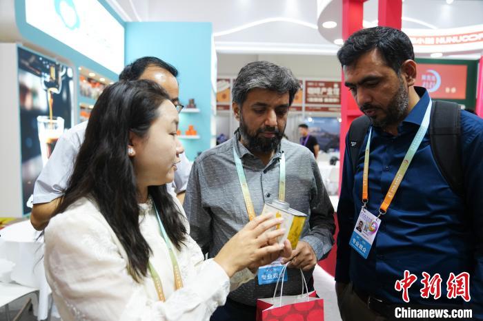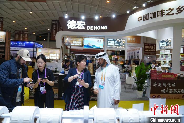 6月19日,來(lái)自巴基斯坦的客商在第9屆南博會(huì)咖啡產(chǎn)業(yè)館了解云南咖啡豆。中新社記者 劉冉陽(yáng) 攝