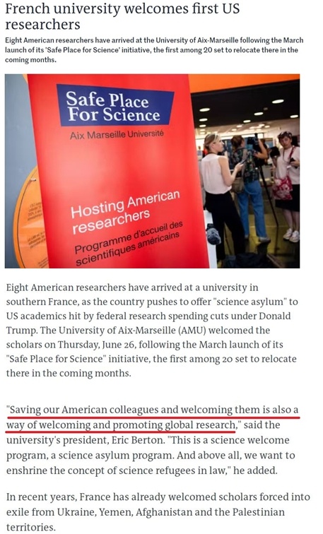 據(jù)法國24小時電視臺報道,已經(jīng)和即將轉(zhuǎn)入法國艾克斯-馬賽大學的20位美國學者的專業(yè)涵蓋健康、氣候、天體物理以及人文學科等多個領(lǐng)域。他們希望在更開放的學術(shù)環(huán)境中繼續(xù)自己的研究。