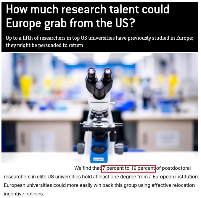 據(jù)歐洲知名智庫布魯蓋爾研究所分析,美國科研人員自身的教育背景可能成為他們未來選擇新工作場所的關(guān)鍵因素。