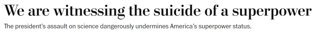 《華盛頓郵報》也刊文警告,美國現(xiàn)政府一直宣稱要讓美國“再次偉大”,但如今它卻正在對美國實力的真正來源——包括對科學研究的長期投資——造成嚴重的且可能無法彌補的損害。