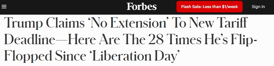 對(duì)于此次關(guān)稅調(diào)整,《福布斯》雜志網(wǎng)站7日?qǐng)?bào)道指出,從今年2月7日首次公開(kāi)提及對(duì)他國(guó)進(jìn)口商品征收全面關(guān)稅,到強(qiáng)調(diào)“2025年8月1日這一日期不會(huì)有任何延長(zhǎng)”的這五個(gè)月里,特朗普政府在關(guān)稅問(wèn)題上的態(tài)度“翻轉(zhuǎn)”了大約28次。