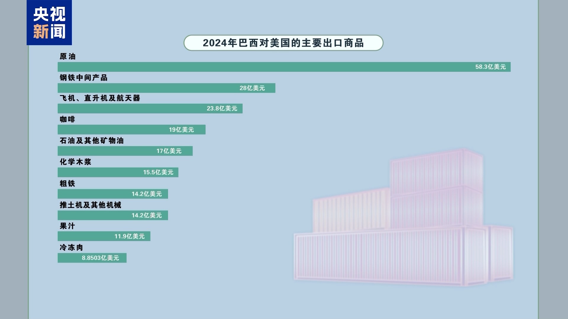 美國有線電視新聞網(wǎng)報道稱,2024年,巴西向美國出口了總額高達(dá)404億美元的商品??Х?、果汁、冷凍肉等美國民眾日常食物以及原油、粗鐵等基礎(chǔ)化工及能源商品都在排名前十內(nèi)。