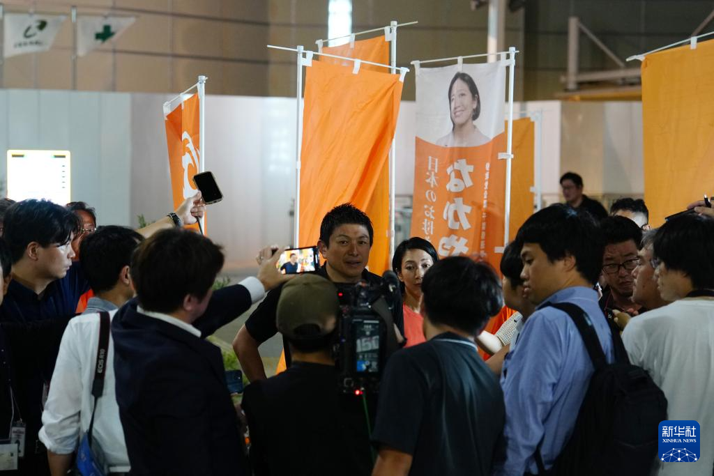 7月13日,在日本千葉縣,參政黨黨首神谷宗幣(中)在街頭演說活動后接受媒體采訪。新華社記者 賈浩成 攝