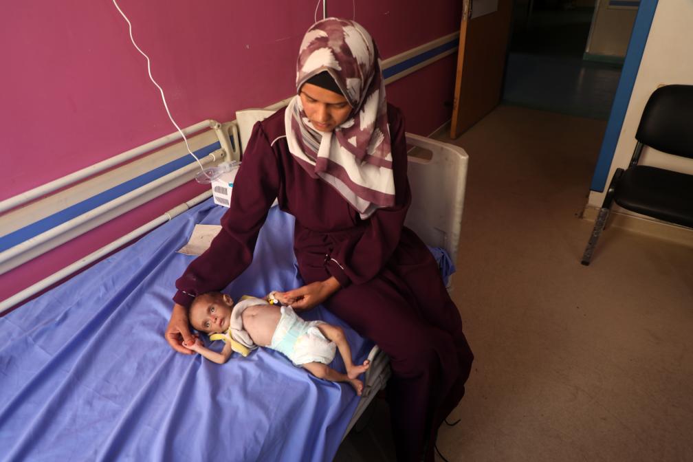 7月23日,在加沙城一所醫(yī)院里,一名女子照顧營養(yǎng)不良的兒童。新華社發(fā)(里澤克·阿卜杜勒賈瓦德攝)