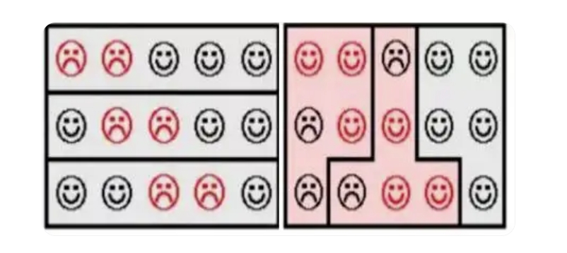 上圖是個(gè)簡化的例子,通過不同的區(qū)域劃分,黑方在左圖的每個(gè)區(qū)域中都占據(jù)多數(shù),對紅方取得了3:0的優(yōu)勢。但按右圖的方式劃分,紅方反而取得了2:1的領(lǐng)先。