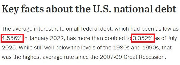 △美國皮尤研究中心的調(diào)查顯示,美聯(lián)邦債務(wù)的平均利率在美聯(lián)儲(chǔ)激進(jìn)加息前的2022年1月曾低至1.556%,而到今年7月已翻了一倍多,達(dá)到3.352%,也是自2007-2009年大衰退以來的最高平均利率水平。