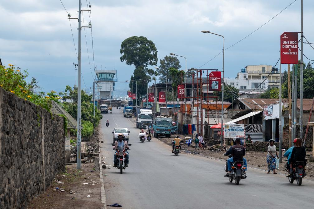 這是5月5日在剛果(金)東部北基伍省戈馬市拍攝的市中心街道和遠(yuǎn)處的機場塔臺。新華社記者鄭揚子攝