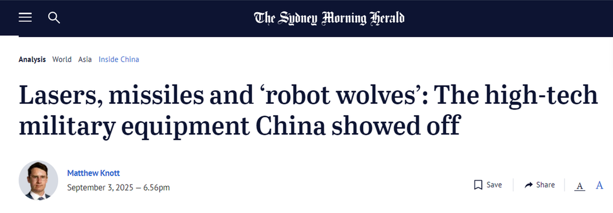澳大利亞《悉尼先驅(qū)晨報》報道稱,中國閱兵式上展示了彈道導(dǎo)彈、激光武器、戰(zhàn)斗機(jī)、水下無人潛航器,甚至還有“機(jī)器狼”。