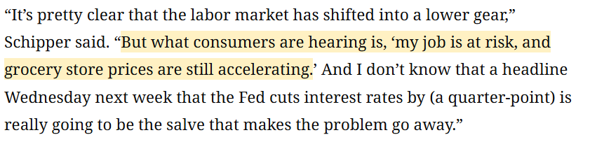 美國圣托馬斯大學(xué)副教授泰勒·施普爾 (Tyler Schipper)認為 :對普通消費者來說,耳邊最真切的聲音是“我的工作隨時可能保不住”,是“超市里的食品雜貨價格還在一個勁往上漲”。所以我實在不確定,下周“美聯(lián)儲降息”的頭條新聞,真能成為化解這些現(xiàn)實困境的良藥嗎?