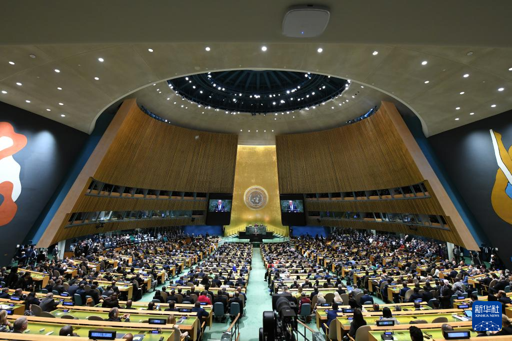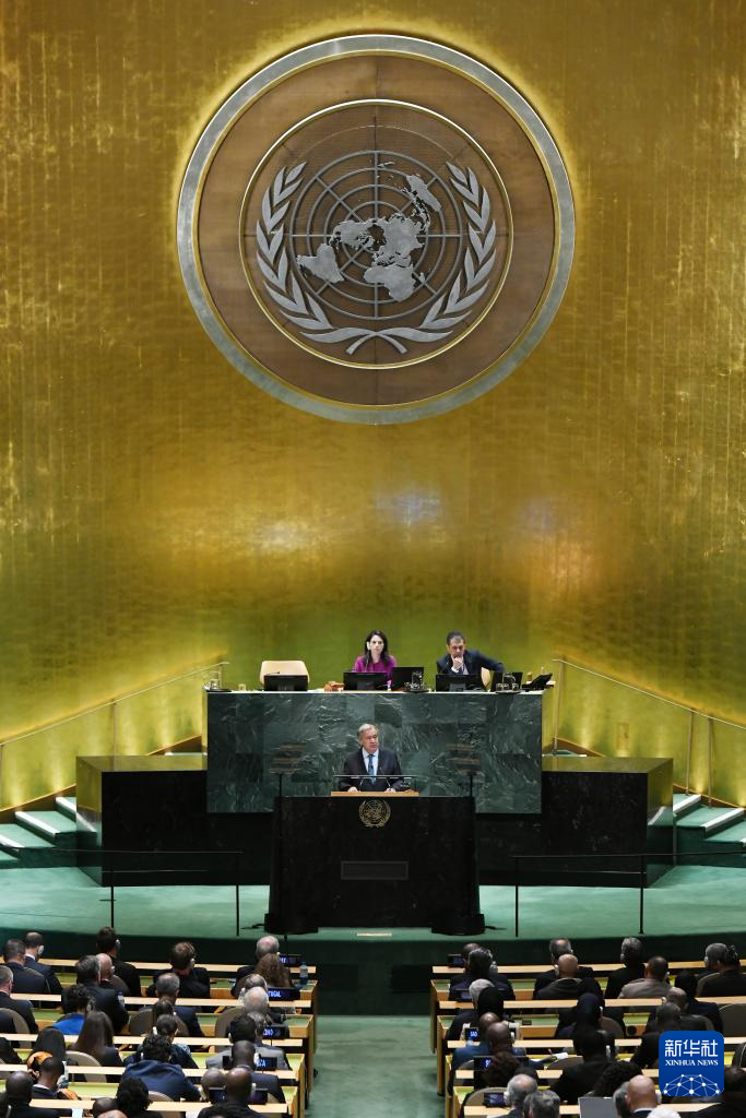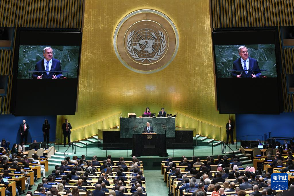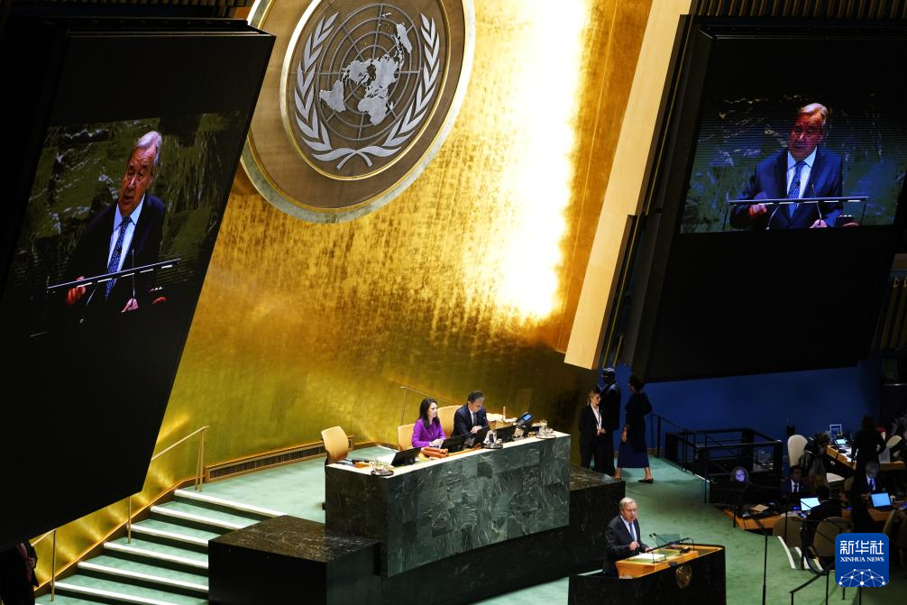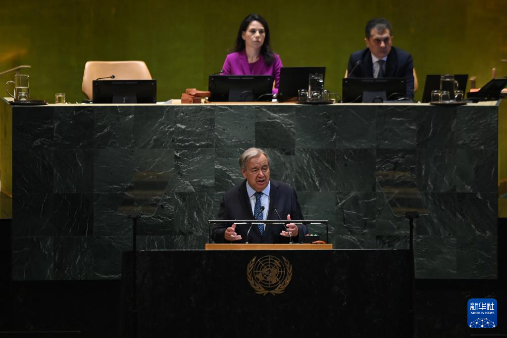 9月23日,在位于紐約的聯(lián)合國(guó)總部,聯(lián)合國(guó)秘書(shū)長(zhǎng)古特雷斯在第80屆聯(lián)合國(guó)大會(huì)一般性辯論開(kāi)幕式上致辭。新華社記者李睿攝
