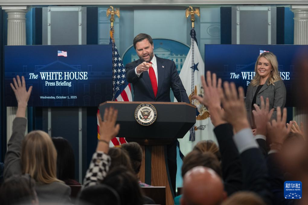 10月1日,在美國(guó)首都華盛頓白宮,美國(guó)副總統(tǒng)萬(wàn)斯(左)請(qǐng)記者提問(wèn)。新華社記者胡友松攝