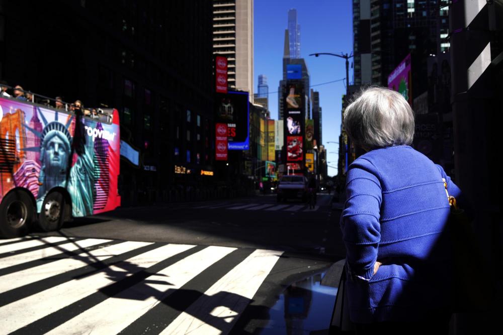 10月1日,在美國紐約曼哈頓的時(shí)報(bào)廣場(chǎng)附近,行人等待通過人行橫道斑馬線過馬路。新華社記者吳曉凌攝