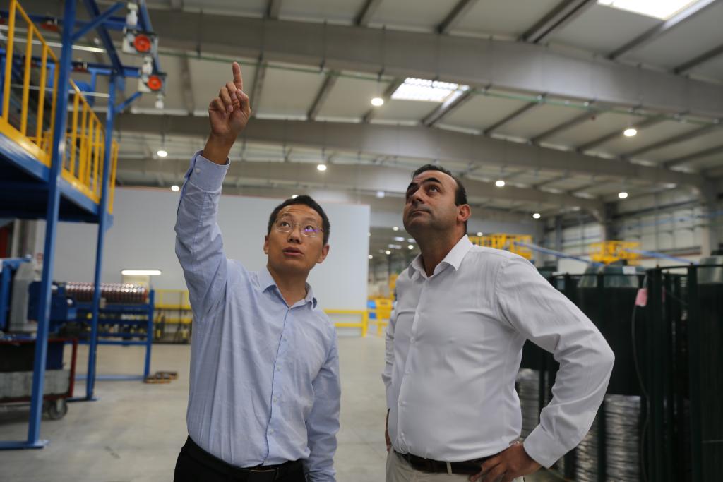 10月3日,在葡萄牙北部奧瓦爾市,亨通集團駐葡萄牙的設備經(jīng)理劉建龍(左)與阿爾科夫雷電纜廠首席運營官卡洛斯·格蘭雅討論技術問題。新華社記者荀偉攝