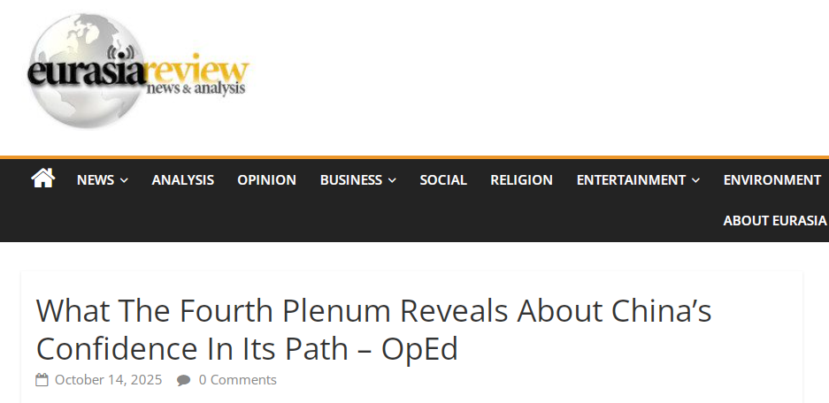 《歐亞評論》(Eurasia Review)網站題為《四中全會展示中國道路自信》的文章指出,中共二十屆四中全會的召開釋放出最鮮明信號,面對全球經濟不確定性加劇的背景,中國依然展現出對自身發(fā)展道路的信心與戰(zhàn)略定力。