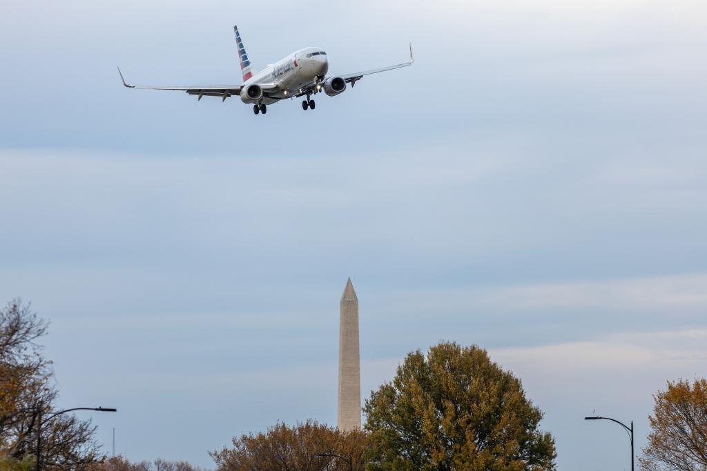 11月7日,一架美國(guó)航空公司飛機(jī)準(zhǔn)備降落在美國(guó)弗吉尼亞州阿靈頓的里根國(guó)家機(jī)場(chǎng)。新華社記者胡友松攝