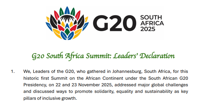 二十國(guó)集團(tuán)(G20)領(lǐng)導(dǎo)人第二十次峰會(huì)當(dāng)?shù)貢r(shí)間11月22日在南非約翰內(nèi)斯堡開(kāi)幕。南非國(guó)際關(guān)系與合作部長(zhǎng)羅納德·拉莫拉在當(dāng)天下午召開(kāi)的記者發(fā)布會(huì)上表示,與會(huì)各方已就會(huì)議核心議程達(dá)成共識(shí),并通過(guò)了《二十國(guó)集團(tuán)領(lǐng)導(dǎo)人約翰內(nèi)斯堡峰會(huì)宣言》。