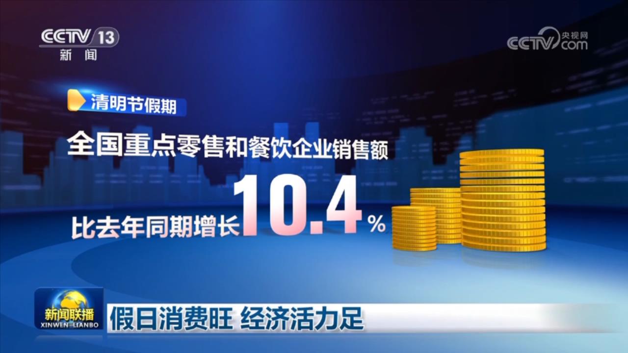商務(wù)部商務(wù)大數(shù)據(jù)監(jiān)測(cè)顯示,清明節(jié)假期,全國(guó)重點(diǎn)零售和餐飲企業(yè)銷售額比去年同期增長(zhǎng)10.4%。商品消費(fèi)方面,綠色有機(jī)食品、服裝、家電、通訊器材等銷售額同比增長(zhǎng)都超過10%,全國(guó)示范步行街客流量和銷售額同比增長(zhǎng)也都超過五成。