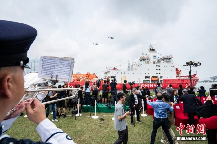 這次,香港更是以“海陸空”上陣歡迎“雪龍2”號(hào)到訪香港。在“雪龍2”號(hào)不遠(yuǎn)處,兩艘拖船和一艘消防船在碼頭附近對(duì)射水柱,形成水拱門。香港飛行服務(wù)隊(duì)的直升機(jī)飛過維多利亞港上空示意致敬,香港警察銀樂隊(duì)在現(xiàn)場(chǎng)奏樂,九龍巴士車隊(duì)貼上歡迎“雪龍2”號(hào)標(biāo)志,還有舞獅隊(duì)歡迎“雪龍2”號(hào)來到香港。
