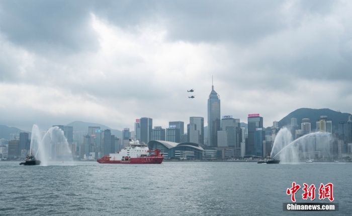 4月8日上午,中國首艘自主建造的極地科學(xué)考察破冰船“雪龍2”號(hào)抵達(dá)香港。圖為“雪龍2”號(hào)通過維多利亞港時(shí)收到海事傳統(tǒng)噴水歡迎。中新社記者 侯宇 攝