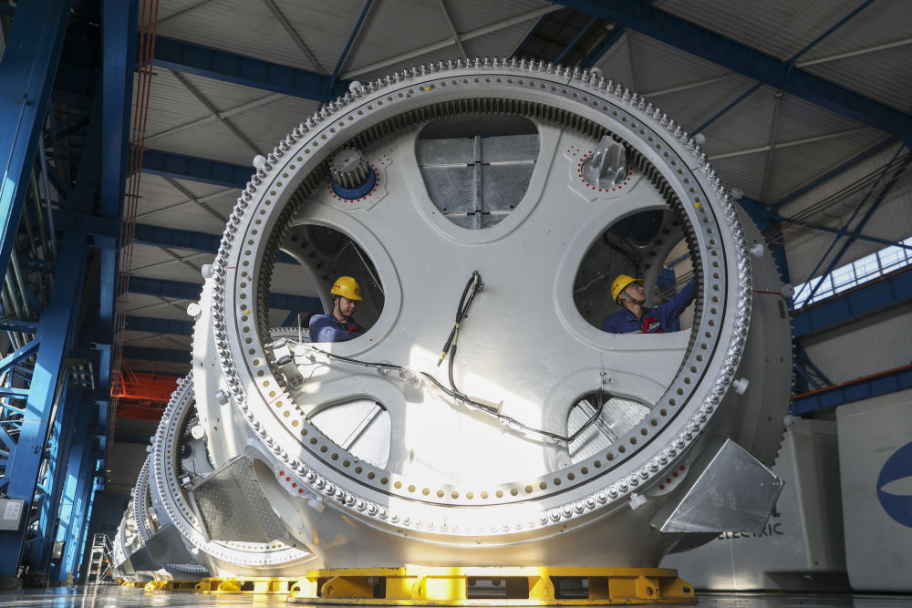 2024年3月5日,在位于黑龍江省齊齊哈爾市的中國一重集團(tuán)有限公司風(fēng)電裝備生產(chǎn)制造廠生產(chǎn)車間,工作人員在組裝設(shè)備。新華社記者 張濤 攝