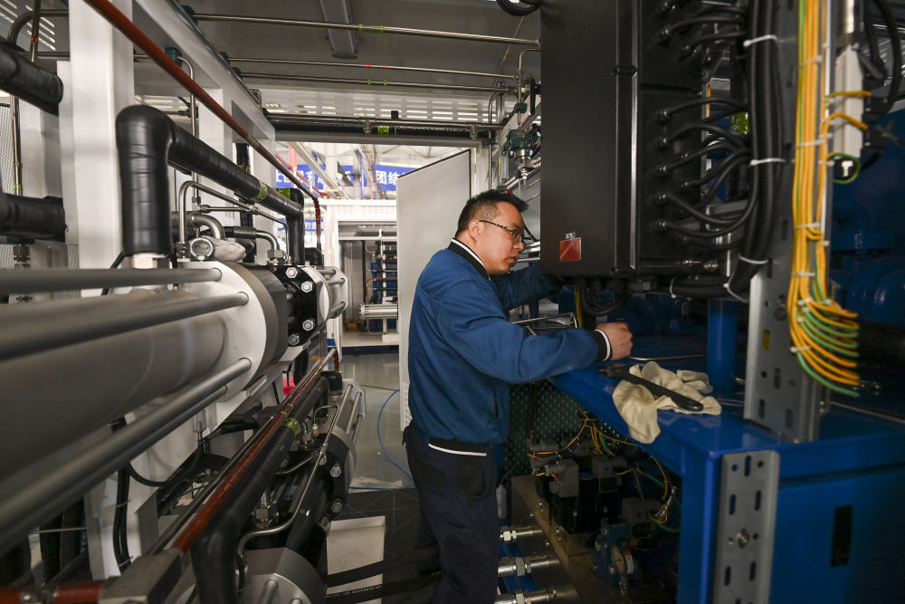 在位于山西省長治市高新技術(shù)產(chǎn)業(yè)開發(fā)區(qū)科技工業(yè)園的一家公司內(nèi),工作人員在調(diào)試氫能設備(4月2日攝)。新華社記者 楊晨光 攝