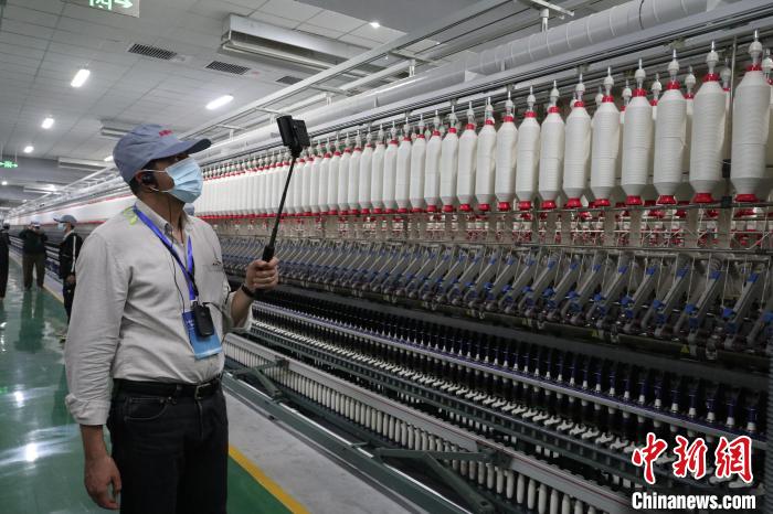 4月13日,外國(guó)媒體人參觀拍攝新疆尉犁縣利華紡織有限公司紡紗廠工作情況。 徐雪瑩 攝