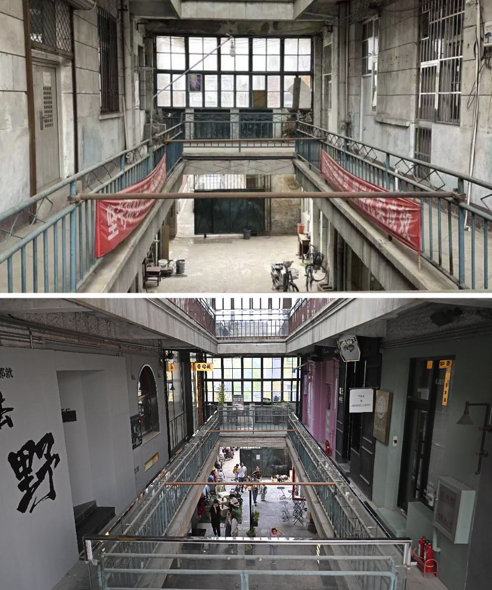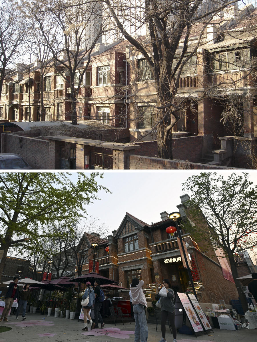 拼版照片:上圖是改造前的先農(nóng)大院(資料照片)。下圖是游客在位于五大道的先農(nóng)大院內(nèi)游覽(4月6日攝)。始建于1925年的先農(nóng)大院是五大道建成最早的建筑群之一,融合了英式聯(lián)排住宅、英式獨(dú)棟別墅等多種特色的建筑風(fēng)格。歲月變遷,這些建筑一度損壞嚴(yán)重,配套設(shè)施老化。2006年起,天津啟動先農(nóng)大院整理項(xiàng)目,對街區(qū)居民進(jìn)行了騰遷,對建筑進(jìn)行了加固修繕,恢復(fù)了街區(qū)的歷史原貌,引進(jìn)了餐飲、文化展示、辦公等業(yè)態(tài),使這里形成了環(huán)境優(yōu)雅的公共藝術(shù)和展示建筑遺產(chǎn)的城市新空間。