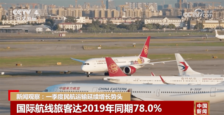 客運方面,全行業(yè)一季度共完成旅客運輸量接近1.8億人次,為歷年一季度客運量最高值,同比增長37.7%,較2019年同期增長10.2%。其中,國內航線完成1.6億人次,規(guī)模較2019年同期增長14.3%;國際航線完成1412.0萬人次,規(guī)?;謴椭?019年同期的78.0%。