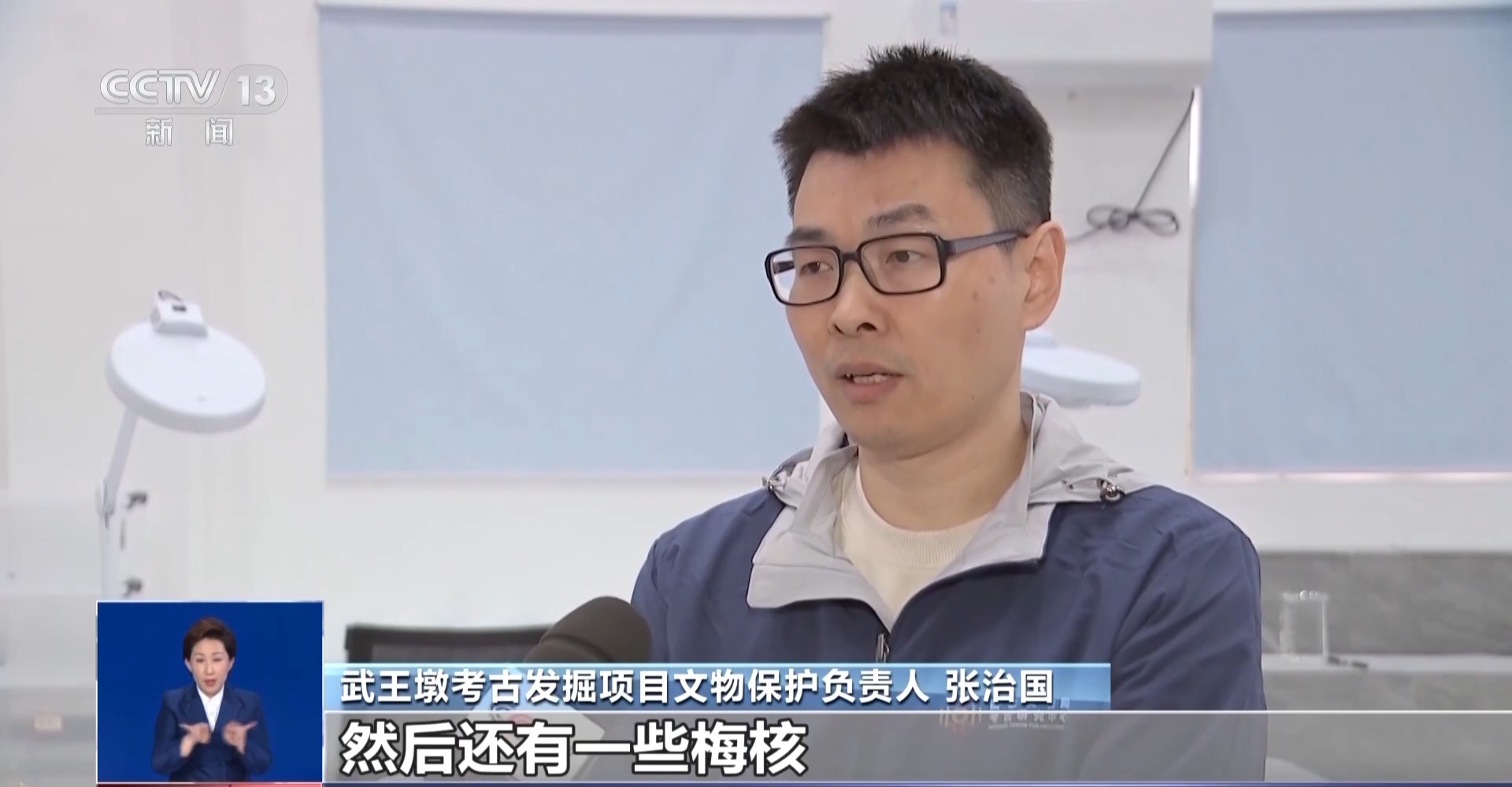 武王墩考古發(fā)掘項(xiàng)目文物保護(hù)負(fù)責(zé)人 張治國:發(fā)現(xiàn)大部分的這個(gè)里面都是一些樹葉,然后還有果核,可能還有一些草編的痕跡,目前初步鑒定出來的有甜瓜籽,然后還有一些梅核。