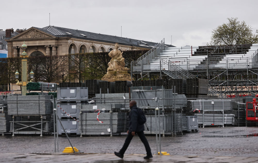 4月2日,行人經(jīng)過法國巴黎協(xié)和廣場的奧運比賽場地和看臺建設工地。新華社記者 高靜 攝