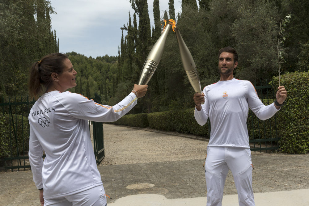 4月16日,第一棒火炬手——希臘運動員、東京奧運會男子賽艇項目金牌得主斯特凡諾斯·恩圖斯科斯(右)與第二棒火炬手、法國游泳奧運冠軍馬諾杜在傳遞圣火。新華社發(fā)(馬里奧斯·羅洛斯攝)