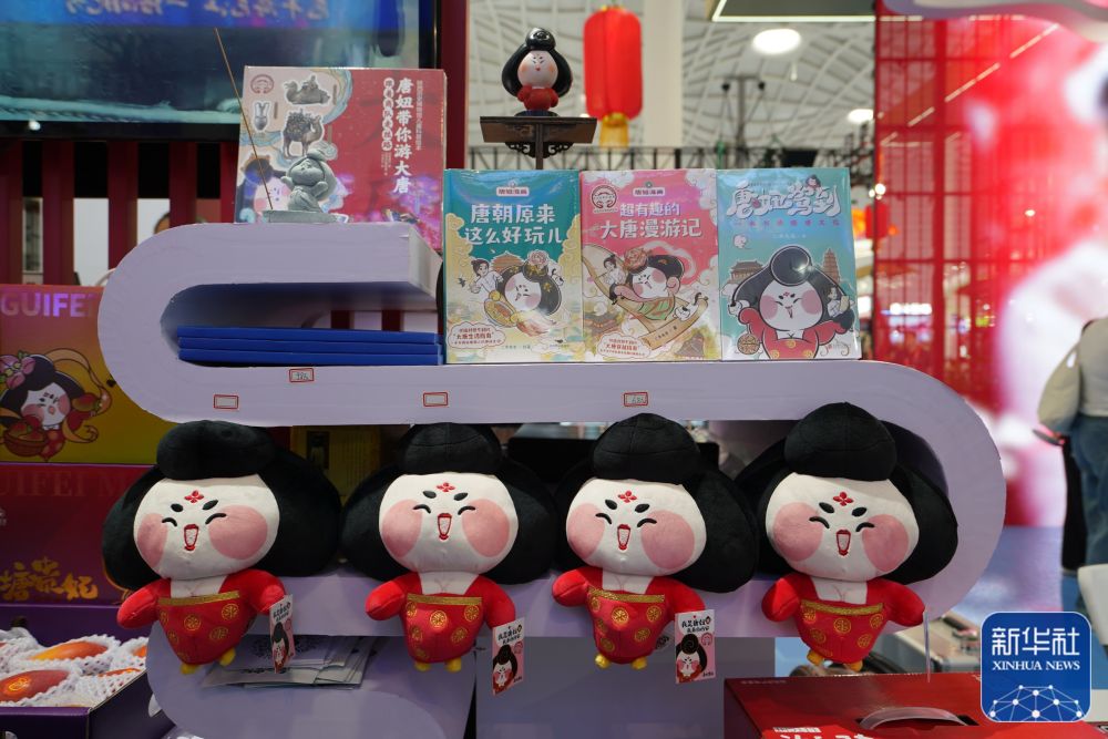 國(guó)貨特色潮品展區(qū)陜西展臺(tái)展示了“唐妞”系列文創(chuàng)產(chǎn)品?!疤奇ぁ钡目ㄍㄐ蜗笕〔挠陉兾鳉v史博物館館藏文物——唐代彩繪仕女俑。新華社記者楊冠宇 攝